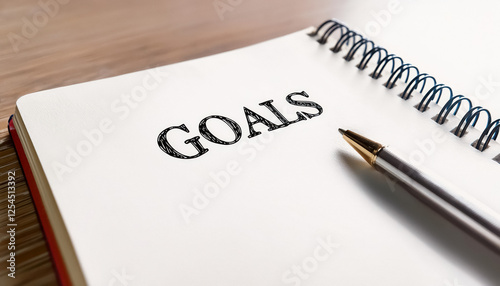 goal, notebook, pen, planning, objective, spiral, writing, paper, word, metallic, notepad, desk, white, closeup, bold, upper case letter, business, strategy, ambition, success, determination, sharpened, achievement, inspiration, motivation, target, future, vision, dream, aspiration, effort, commitment, growth, progress, accomplishment, result, intention, purpose, concept, idea