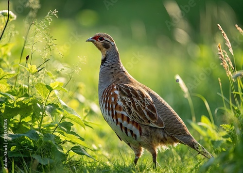Closeup of a Partridge in a Lush Field, Capturing Nature's Beauty in the Rule of Thirds for Wildlife Enthusiasts and Bird Lovers, Showcasing Vibrant Colors and Natural Habitat