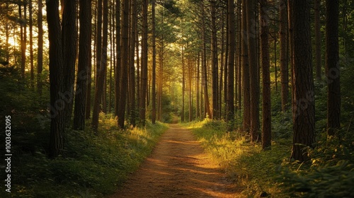 Close-up of a peaceful forest path with tall, dense trees on either side and soft, golden light