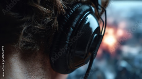 earphones, gaming, player, ear, audio, sound, listening, device, technology, closeup, black, cable, wire, computer, screen, display, game, online, cyberspace, virtual, reality, life events, entertainment, fun, hobby, leisure, activity, person, man, young, adult, back, neck, hair, shoulder, skin, face, profile, view, sharpened, detail, texture, surface, material, soft, smooth, dark, bright