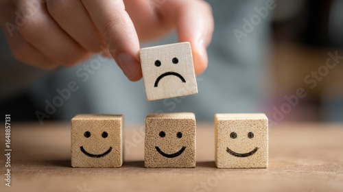 Close-up of a person's hand placing a sad face emoticon block on top of a row of happy face blocks on a wooden , symbolizing emotional contrast and mood change