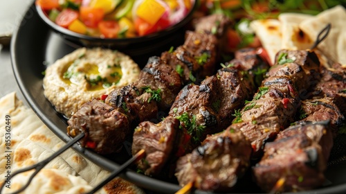 Close-up of a plate of Middle Eastern lamb kebabs with sides of hummus and pita bread
