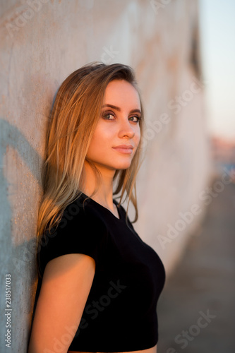 Close-up of a portrait of a beautiful blonde woman looking at the camera against the wall of outdur