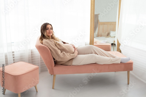close-up of a pregnant woman on the bed hugging her pregnant belly. a beautiful pregnant woman lies on a sofa in a large beautiful living room near the window