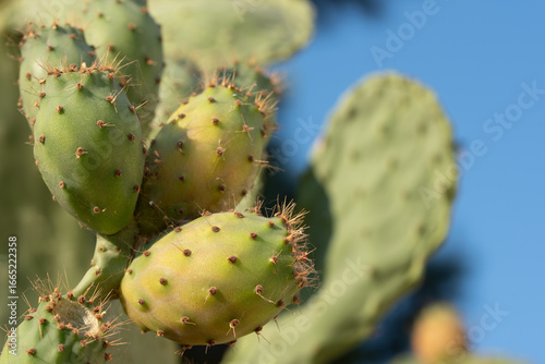 Close-up of a prickly pear cactus growing outdoors, in landscape format. In summer, ripe prickly pears hang from the plant.