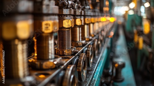 machine, mechanism, gear, nut, bolt, metal, steel, iron, industry, production, manufacturing, factory, assembly, line, detail, closeup, engineering, mechanical, precision, equipment, technology, automation, chrome, shiny, workshop, construction, part, component, system, complex, intricate, row, order, structure, metallic, industrial, strength, toughness, resilience, support, connection, fastener, tight, secure, functional, macro, foreground, sharpened, depth