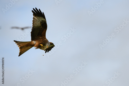 low angle, closeup, flying, blue, cloudless, sky, bird, hawk, feather, plumage, beak, outdoors, animal, wildlife, nature, avian, fauna, ornithology, flight, predator, wales, britain