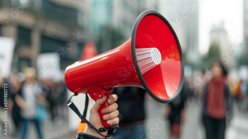 Close-up of a red megaphone held high at a protest, amplifying voices for social justice and change
