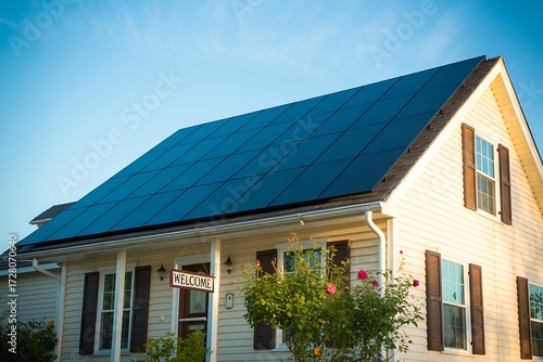 house, home, solar panel, roof, residential, building, window, shutter, siding, porch, flower, rosebush, greenery, lawn, sky, blue skies, daylight, sunny, exterior, facades, architecture, real estate, property, dwelling, energy, renewable energy, sustainable, environmentally friendly, clean energy, suburban, daytime, closeup, view, front door, entrance