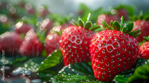 Close-up of a ripe strawberry in a field, bathed in warm sunlight