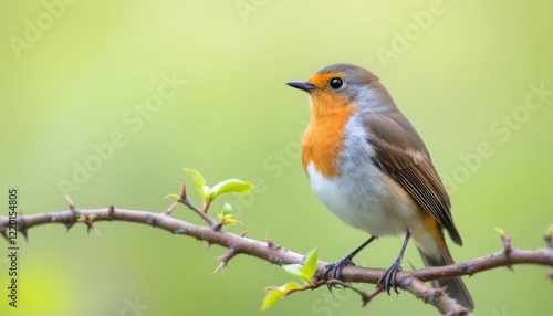 robin, bird, wildlife, nature, spring, closeup, tree branch, perched, blurred background, out of focus, green background, soft focus, springtime, detail, horizontal, animal portrait, feather, ecology, wild bird, photo, vivid colors, warm colors, birding, closeup, blur, green leaf, thorn