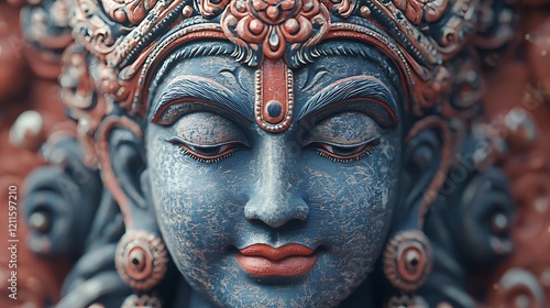 hindu, deity, statue, sculpture, god, krishna, vishnu, blue, serene, peaceful, calm, spiritual, religious, art, culture, india, detail, closeup, face, ornate, intricate, texture, ancient, traditional, belief, faith