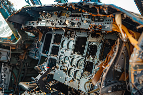 Close-up of a shattered cockpit, remains of the plane scattered around, impact and severity of the crash