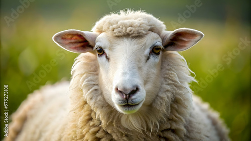 Close-up of a sheep with fluffy white wool , farm animal, livestock, woolly, fluffy, cute, mammal, domestic