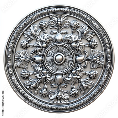 silver, metal, ornament, decor, design, round, circle, floral, pattern, texture, background, vintage, antique, classic, elegant, luxury, interior, art, craft, detail, element, relief, emboss, ornate, acanthus, rosette, molding, scroll, symmetric, decorative, stylish, beautiful, artistic, artwork, image, picture, photo, isolated