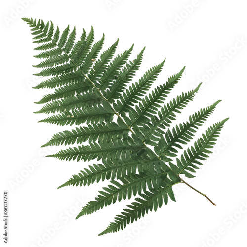 Close-up of a single green fern leaf, isolated on a white background, showcasing natural texture and intricate details of the foliage.