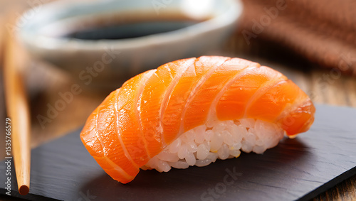 salmon, sushi, japanese, food, raw, seafood, close, up, photo, delicious, eatery, cookery, single, piece, soy, sauce, chopstick, slate, plate, dark, background, styling, high, quality, fresh, vibrant, orange, rice, grain, texture, culinary, gastronomy, meal, dinner, lunch, healthy, protein, omega, three, dish, fish, asian, bar