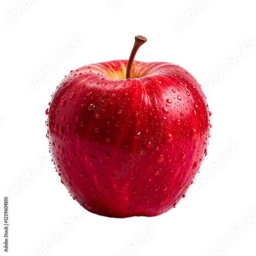apple, fruit, food, waterdrop, shiny, closeup, red, juicy, fresh, healthy, nourishment, vitamin, diet, delicious, sweet, photo, still life, object, single, isolated, background, clean, bright, vibrant, texture, glossy, nature, organic, produce, crisp, ripe, plant, stem, detail, macro, image, studio, honed, round, full, colours