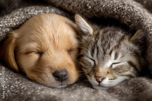 Close-up of a sleeping kitten and puppy nestled in a blanket, cozy and heartwarming scene
