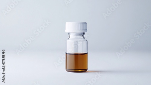 Close-up of a small glass vial with a white cap, containing a brown liquid, set against a minimalist white backdrop, evoking a sense of purity and simplicity.