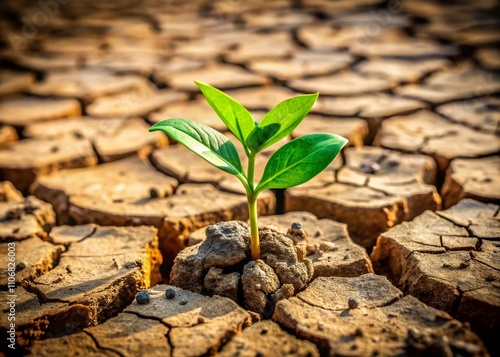 Close-up of a Small Sprout in Cracked Earth Representing Resilience and Rebirth, Emphasizing the Importance of Environmental Preservation and the Call to 'Save Earth, Save Life'