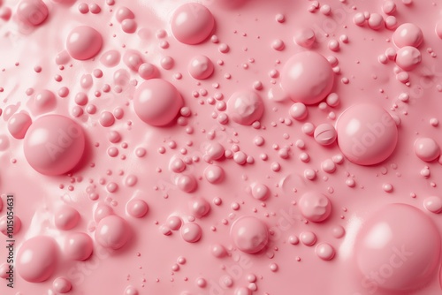 Close-up of a smooth pink surface with glossy droplets and bubbles, creating a delicate and vibrant visual texture.
