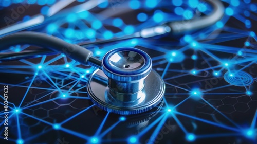 Close-up of a stethoscope resting on a digital interface with a network pattern and glowing blue nodes, representing medical technology and healthcare innovation.
