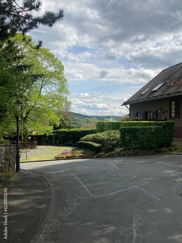 Closeup of a street that sits on top of a mountain and where there is a house and a park