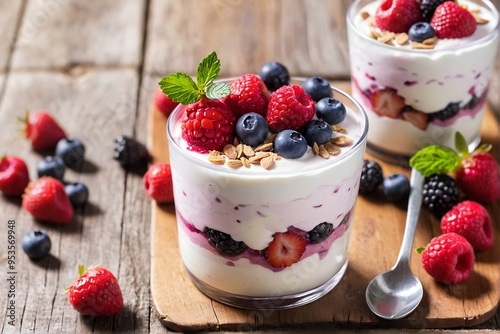 dessert, closeup, wooden table, selective focus, copy space, refreshing, homemade, food photography, colourful, food, fruit, yogurt, cream, berry, raspberry, sweet, strawberry, breakfast, fresh, milk, glasses, muesli, healthy, delicious, blueberry, yogurt, granola, white