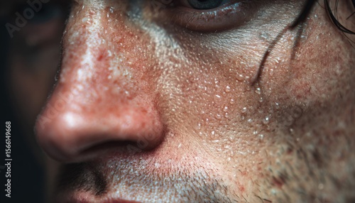perspiring, face, man, closeup, skin, drop, moisture, texture, detail, male, human, portrait, head, expression, intense, effort, determination, physical, activity, exhaustion, sleepy, energy, physical exercise, fitness, health, body, part, feature, eye, nose, beard, stubble field, dark, shadow, light, contrast, photo, macro, detailed, realistic, gritty, raw, natural, real, authentic, gaze