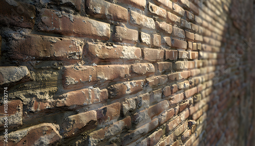 Close-up of a textured brick wall, showcasing weathered red and brown tones and intricate patterns of natural aging.
