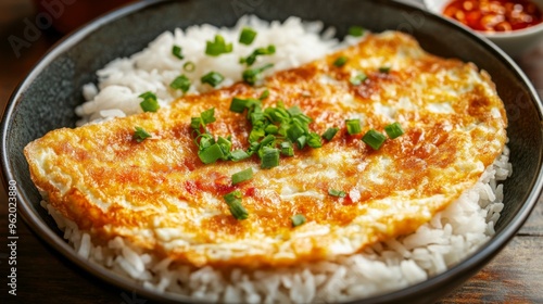 Close-up of a Thai-style omelette with golden, crispy edges, served atop a bowl of rice, with a small dish of chili sauce on the side.