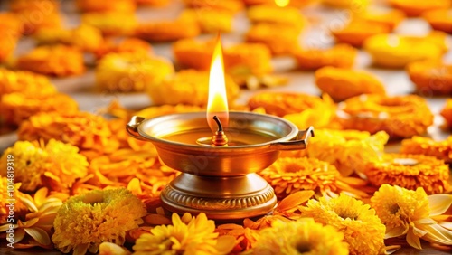 Closeup of a traditional brass oil lamp deepam lit with ghee, surrounded by marigold petals, brass, oil lamp, deepam