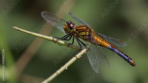 green, brown, twig, tree branch, plant, stem, background, blur, sharpened, detail, fauna, invertebrate, arthropod, animal, photo, summer, spring, wild, life, beauty, bright, vibrant, perched, sitting, delicate, fragile, flight, leg, abdomen, chested, head, antennae, texture, pattern, environment, ecosystem