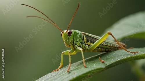 Close-up of a vibrant green grasshopper perched on a leaf.