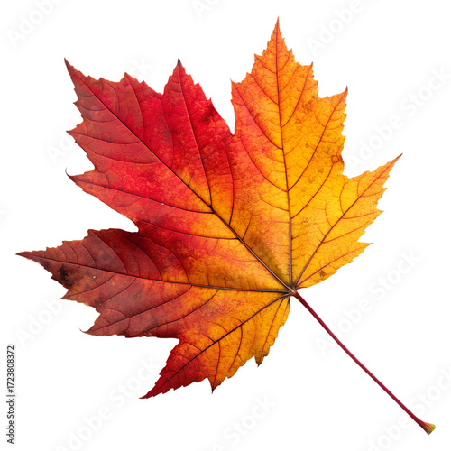 Closeup of a vibrant red and yellow maple leaf isolated on transparent background, showcasing autumn colors and intricate details