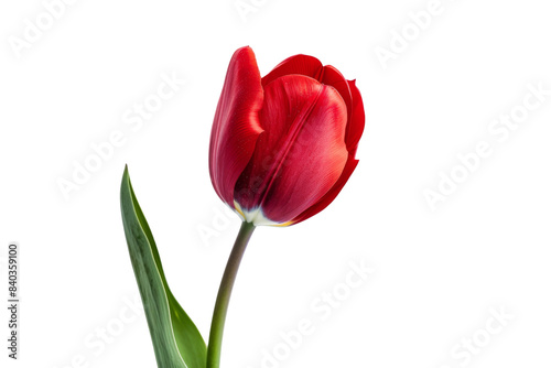 Close-up of a vibrant red tulip with green leaves, isolated on a white background. Perfect for floral-themed designs and nature-inspired projects.