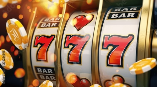 Close-up of a vibrant slot machine with spinning reels displaying lucky sevens and colorful casino chips scattered around