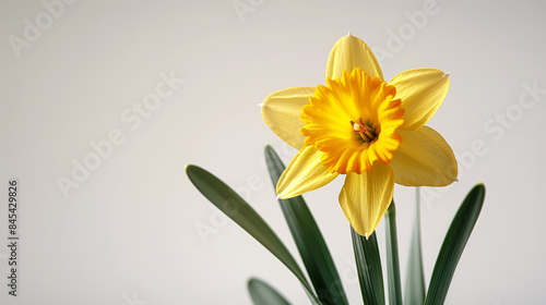 Close-up of a vibrant yellow daffodil in front of a simple light gray background.
