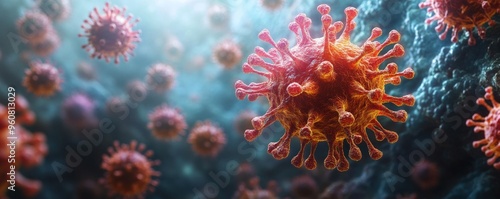 Close-up of a virus with spiky surface, microscopic view of virus particles.