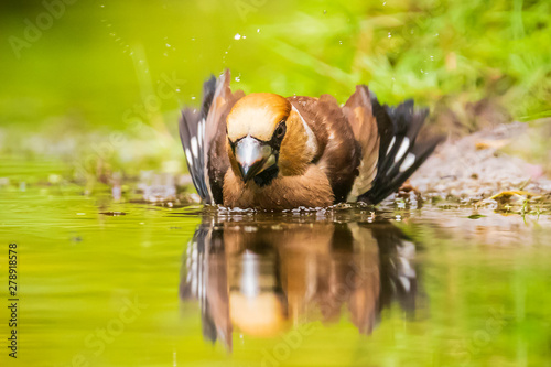 Closeup of a wet hawfinch, Coccothraustes coccothraustes washing, preening and cleaning in water.