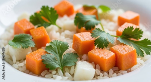 bowl, rice, carrot, cilantro, cubed, garnish, closeup, food, meal, cookery, dining, white, green, orange, plant, vegetable, root, healthy, fresh, culinary, diet, vegetarian, vegan, appetence, texture, epicure, detail, bright, colours, natural, organic, cooked, prepared, plate, serve, eat, tasty, delicious, composition, arrangement, studio, photograph