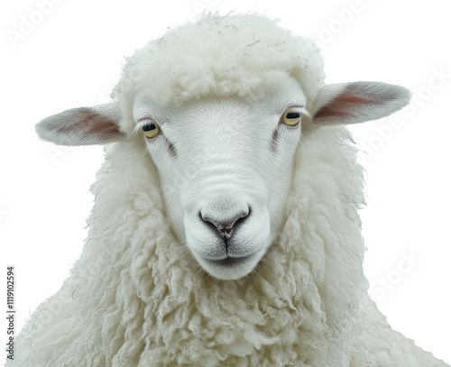 Close-up of a white sheep against a transparent background, isolated portrait. Farm animal and tranquility concept