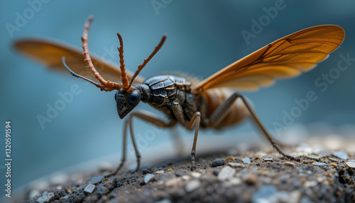 insect, standing, closeup, wing, semitransparent, antennae, outdoors, macro, gravel, ground, creature, arthropod, wildlife, nature, animal, specimen, biology, zoology, fauna, small, surface, textured, detailed, single, eye, looking, posing, exploration, entomology, study, science, discovery, wild, environment, sharpened, foreground, neutral, colours, tiny, observing