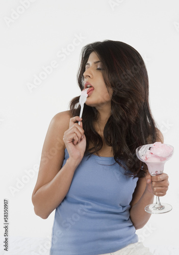 Close-up of a woman licking a spoon of ice cream