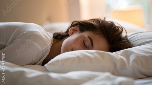 Close-up of a woman sleeping peacefully in bed with warm ambient light creating a cozy atmosphere