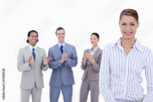 Close-up of a woman smiling with business people applauding