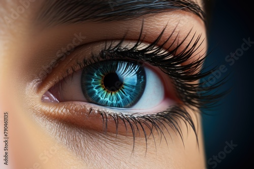 Close-up of a womans blue eye with strikingly long lashes. Generative AI
