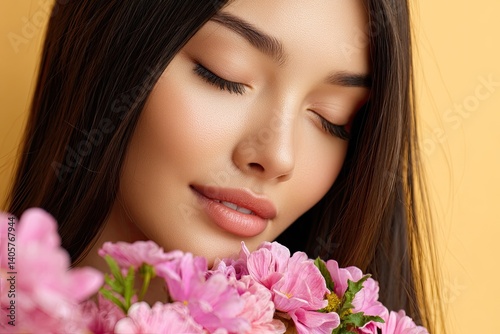 Close-up of a woman's face with eyes closed, holding pink flowers near her cheek in soft focus