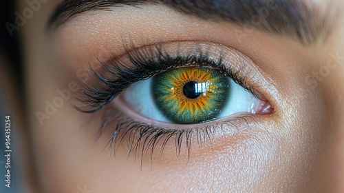 Close-up of a woman's green and amber eye with detailed iris patterns and long eyelashes, showcasing natural beauty and intricate features